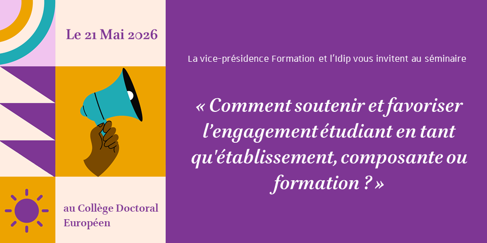 La vice-présidence Formation et l’Idip vous invitent à la journée « Comment soutenir et favoriser l’engagement étudiant en tant qu’établissement, composante ou formation ? » qui se déroulera le 21 mai prochain au Collège Doctoral Européen.